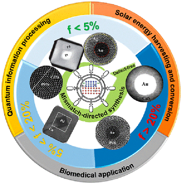 异质纳米晶以纳米或量子尺度的金属或半导体材料做为基元构件,在催化、能量转化与存储、光电器件、生物医学诊断与治疗、量子信息处理等领域具有重要的应用前景。大量研究表明,不同基元构件之间异质界面的晶格结构与电子特性对异质纳米晶的整体性能具有关键性作用,其深层原因是界面处晶格失配度的大小从热力学上决定了晶体生长的不同机制。因此,晶格失配度是异质纳米晶合成与应用中的一项重要参数,其不仅与异质纳米晶合成的难易程度密切相关,同时会对所合成材料界面处的晶格缺陷及晶格应变状态产生直接影响,从而可进一步用于调控异质纳米晶的电子与光学特性。